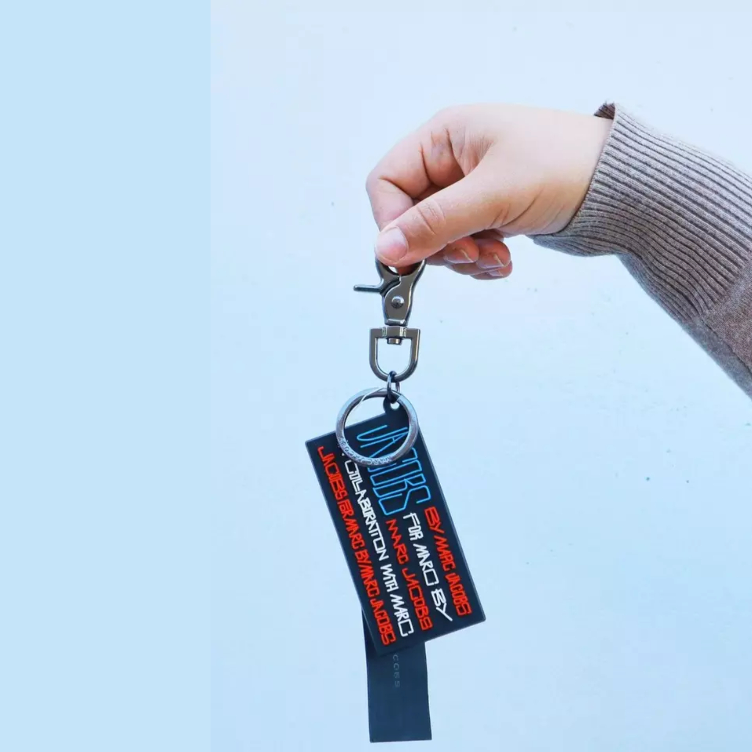 The Marc by Marc Jacobs Logo USA Flag Keychain is a distinctive accessory that merges design and practicality with a patriotic twist