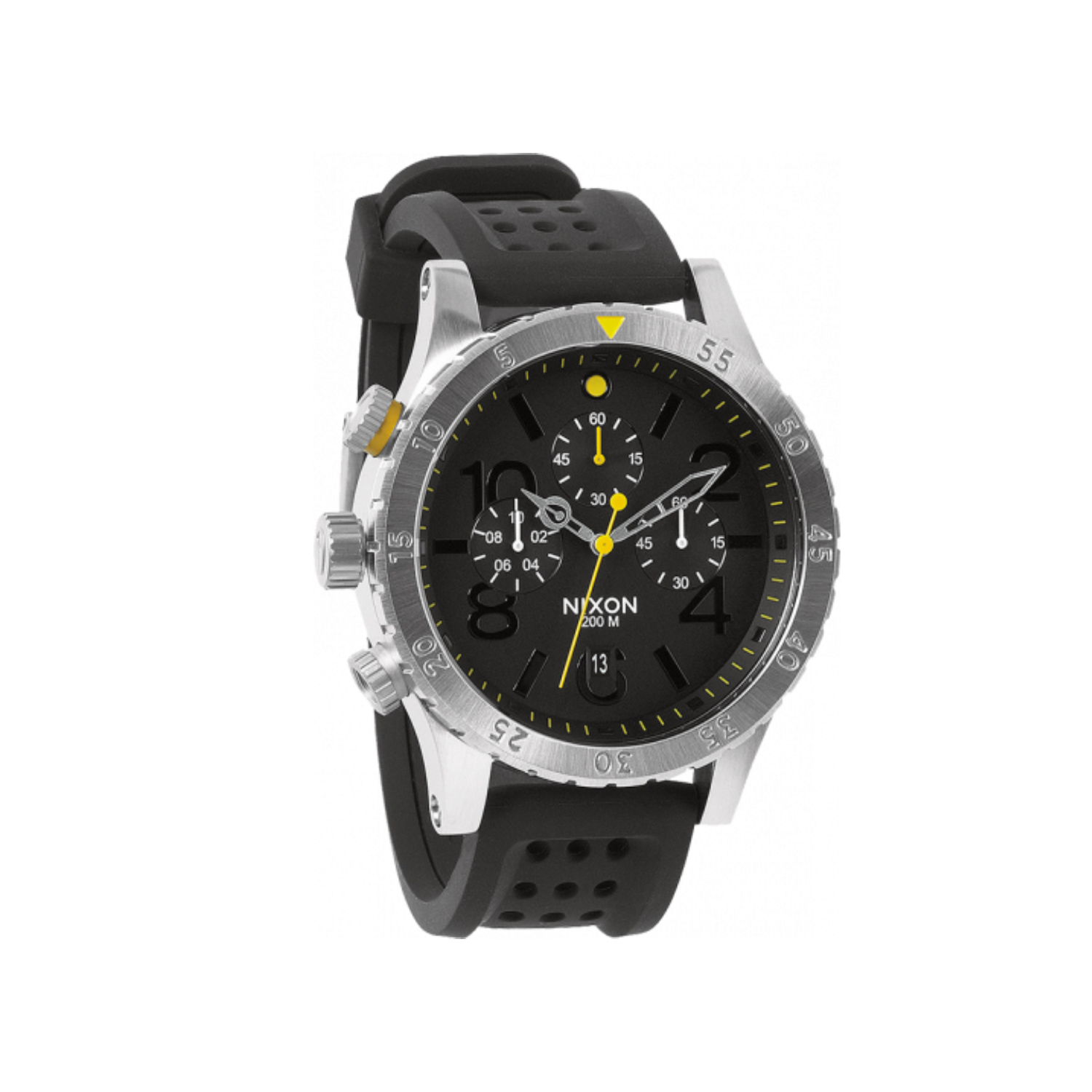Band Colour Black Band Material Rubber Band Width 23 Brand NIXON Calendar Type Date Case Diameter 48 Millimeters Case Material Stainless Steel Case Thickness 14 Millimeters Clasp Tang Buckle Collection 48-20 Chrono P Dial Colour Black Crystal Material Mineral Display Type Analog Case Shape Round Item Weight 136 g Model Number 48-20 Chrono P Grand Prix Model Year 2011 Part Number A2781227-00 Special Features Chronograph, measures-seconds Warranty Type Contact seller of record Movement Japanese Quartz Water Resistance Depth 200 Meters Band size Men’s Standard